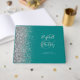 This elegant wedding guest book features a left-hand border of faux silver glitter on a teal blue background. Easily customise the silver grey text with the names of the bride and groom in whimsical handwriting calligraphy over a large ampersand. Add additional text of your choice to the front and spine.