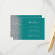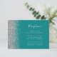 The left-hand edge of this elegant modern wedding reception enclosure card features a silver faux glitter design. The customisable text combines pale silver grey handwriting, copperplate and italic fonts on a teal blue background. The reverse side features a matching teal and silver glitter design.