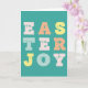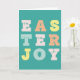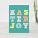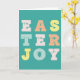 A modern religious Easter cards with "Easter Joy" in bold distressed font in pastel pink, orange, yellow and light teal on a dark teal background. Inside is an editable bible verse: "Blessed be the God and Father of our Lord Jesus Christ! According to his great mercy, he has caused us to be born again to a living hope through the resurrection of Jesus Christ from the dead." 1ST PETER 1:3