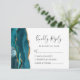 The left-hand edge of this elegant modern wedding RSVP enclosure card features a teal watercolor agate border trimmed with faux gold glitter. The title "Kindly Reply" appears in handwriting script, with customizable text below in charcoal gray copperplate font on a white background. The reverse side features a matching teal and gold agate design.