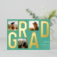 Celebrate your graduation with this modern photo typography graduation foil invitation. This sleek design features luxurious foil typography with the word "GRAD" prominently displayed. The invitation allows you to showcase three of your favourite photos on the front, creating a unique and personalised keepsake. Customise with your name, school, and graduation year on the back to share your achievement with friends and family. Perfect for high school or college graduates, this invitation beautifully captures your milestone moment with a stylish teal backdrop.