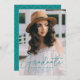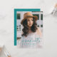 Invite guests to celebrate the grad with our stylish photo graduation invitations. The graduation invitations feature the graduate's vertical photo with "Graduate" in a teal modern calligraphy script overlay. Personalize the front of the modern graduation invite by adding the graduate's name, school name, and graduation year. The invite reverses to display your graduation party details and a trendy teal and white dotted geometric pattern.