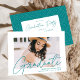 Invite guests to celebrate the graduation with our modern photo graduation party invites. The trendy graduation party invites feature the graduate's photo with "Graduate" in a teal modern calligraphy script overlay. Personalize the front of the invites by adding the graduate's name, school name, and graduation year. The invite reverses to display your graduation party details and a trendy teal and white dotted geometric pattern.