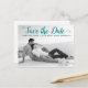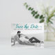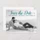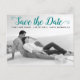 Modern teal blue script wedding Save the Date photo postcard. This contemporary typography Save the Date design features a black and white photo of the couple and the text "Save the Date" in a modern script font.