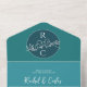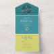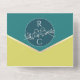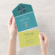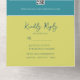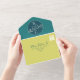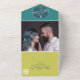 Unique, minimalist, modern, contemporary bright teal blue and yellow all-in-one wedding invitation with QR code, monogram with hand drawn love couple birds, trendy handwritten script and custom picture of the at the back.
