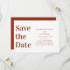 These save the date cards feature a modern and elegant terra cotta and white design. "Save the Date" is printed in a large font on the left side. The wedding or event information is printed on the right.