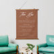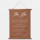 Modern terracotta wedding bar menu on hanging canvas with handwritten font for "The Bar" and your custom drinks menu on hanging canvas tapestry. Background and text colour can be adjusted in the design tool.