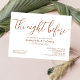 Elevate your wedding rehearsal dinner with our "The Night Before" Wedding Rehearsal Dinner Invitation. Featuring elegant brown calligraphy on a clean white background, this invitation embodies modern simplicity and sophistication. Ideal for couples who appreciate a minimalist aesthetic, this design is perfect for any wedding theme, from rustic to boho-chic. Whether you're planning a vintage-inspired event or a bold, modern celebration, this invitation sets the tone for an unforgettable evening. As part of your rehearsal dinner decorations and supplies, this card complements any décor, ensuring a cohesive and stylish presentation. Make a lasting impression with this timeless and elegant invitation.