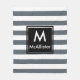 Modern white thick stripes with a black square monogram in the centre. Personalised text and accent stripes in the background!