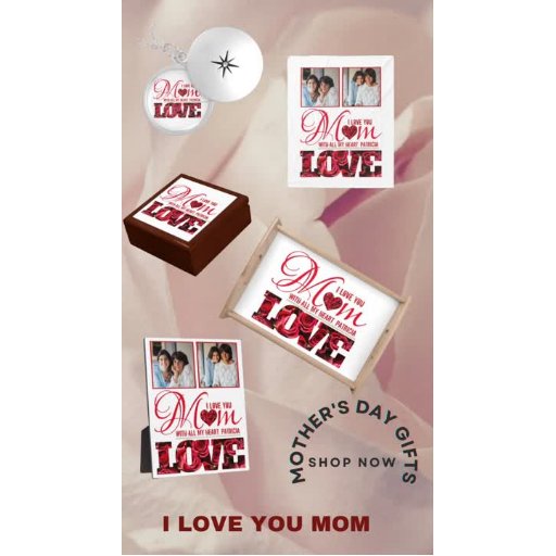 A pretty bouquet of modern, trendy, chic, red roses framed in a heart with a dedication to mum "I love you mum", all this on a stand of letters full of roses with the word LOVE. Stunning contrast of red on a white bottom.