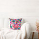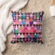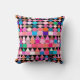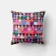 Square pillow patterned in bands of geometric shapes, in a modern take on a tribal pattern, in rich jewel colours of sapphire blue, jade green, rose quartz, amethyst, and coral on a black background