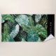 Add tropical flair to your beach or pool days with this cool botanical printed beach towel in beachy shades of vibrant green and rich black. Design features a pattern of green banana leaves, monstera, and palm fronds on a black background. Personalize with an individual name, family name, or monogram along the bottom in classic white lettering.
