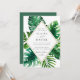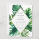 Modern wedding invitation design featuring watercolor tropical greenery like monstera and palm leaves on a white background. Reverse side of the invitation is in deep green colour. Perfect wedding invitation style for tropical, destination and beach weddings.