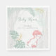 Baby Shower Party Napkins | Modern Tropical Leaves Pink Flamingo - Tropical Leaves Pink Flamingo Gender Neutral Baby Shower - New mother flamingo and her baby set in a geometric terrarium style frame surrounded by light pastel muted green tropical leaves all on a whitewash wood background - easy to personalise - design ©WhimsicalArtwork™