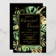 This modern tropical rehearsal dinner invitation features green and gold palm, philodendron, and fern leaves on a black background. An elegant gold foil frame highlights the gold foil text. Gold foil splatters accentuate this exotic botanical design and brings a bit of sophisticated whimsy to the invitation. This island oasis invite is perfect for any outdoor, beach or tropical themed rehearsal dinner.