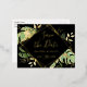 This tropical modern and elegant gold foil "save the date" postcard is an easy way of letting everyone know you're getting married. "Save the Date" along with the couple's names and wedding date are featured on the front in the foil colour of your choice. The text is highlighted by a foiled frame. Tropical leaves and ferns peak out from behind the frame on a black background. Gold foil splatters add a bit of sophisticated whimsy to the design. The back of the postcard has the upcoming wedding details in black.