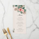 Modern wedding menu design featuring dusty pink watercolor flowers and tropical leaves on a cream background.
