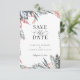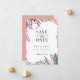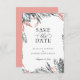 Modern tropics palm leaf frame, save the date card. Card features trendy watercolor painted tropical leaves in coral pink and silver greens, elegant typography design and matching coral pink colour backing.