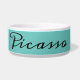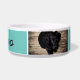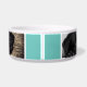 Modern abstract turquoise background with dog`s name in black script and 2 photos. This dog bowl comes with a dog`s name in black script and 2 photos - personalise the bowl with your dog`s name and insert two of your photos into the template.