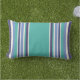 This outdoor lumbar pillow features vertical stripes of varying widths in turquoise, navy blue, cornflower blue, and off-white. An ideal summer pattern for patio or poolside.