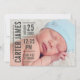 Photo birth announcement card features a modern style text overlay with the baby's name and birth details on the front. A collage with five (5) additional newborn photos is included on the back of the card. The dark charcoal grey text colour can be customised to contrast your image.