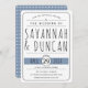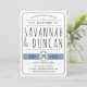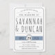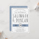 This contemporary wedding invitation showcases a combination of black and white typography complemented by a touch of dusty blue. The main text exudes elegance with its whimsical hand-drawn style typography in black against a white backdrop, while the wedding date stands out on a dusty blue banner. A black border with rounded corners adds a sophisticated touch to the overall design of the invitation. On the back, a stylish geometric pattern featuring white crosses on a blue background adds a modern and chic element to the invitation suite.