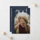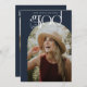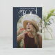 A Clean and Chic modern typography script with an arched photo frame on a navy blue colour background. Easily customise with your graduation photos and invitation details on the front and back.