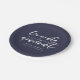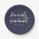 Modern typography bold brushed script in white, personalised graduation party plate. Background colour shown in classic navy blue can be customised.