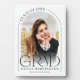 This white and black simple minimalist graduation photo plaque is modern and classy, with a photo of the grad in an arch frame, and elegant modern typography.