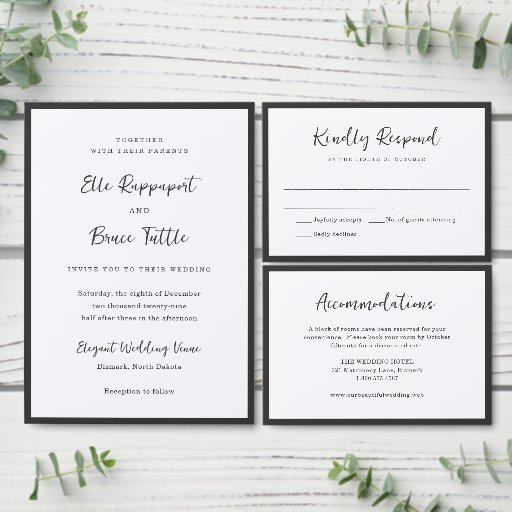 This design is part of a timeless minimalist wedding invitation suite featuring elegant script typography paired with a classic serif font in soft black and white. This modern design embraces simplicity with a refined layout, perfect for couples seeking understated sophistication. Ideal for formal, modern, or classic weddings, this clean aesthetic ensures a polished and cohesive look.
