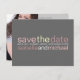 A graphically styled 'save the date' postcard announcement that features a trendy colour scheme and bold typography. Let friends and family know that you've set the date with a contemporary design that's simple but unique. Available in a variety of colour combinations; this one in two shades of pink with hints of yellow and white on a soft dove grey background.