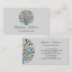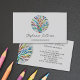 This modern and unique interior designer business card is decorated with a colourful mosaic design and stylish script typography on a grey background.