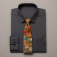 Make a bold statement with our Modern Urban Cityscape Tie. This striking design features vibrant orange and red buildings and trees against a green background, creating a unique urban landscape. With its modern take on city architecture, this tie is sure to stand out in any outfit. Perfect for those who love the fusion of nature and urban life, this stylish accessory adds a touch of sophistication to your wardrobe.