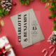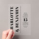 Featuring sleek vertical text and minimalist design, this bold wedding invitation exudes modern elegance. Its contemporary aesthetic highlights clean lines and typography, making it the perfect choice for couples seeking a sophisticated yet minimalist announcement. This striking design offers a modern twist on classic wedding stationery.