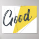 Modern, vibrant, bold, playful graphic design of a word "Good" with triangles in yellow and grey colours. Handwritten, brush stroke style typography.