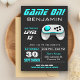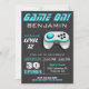 This modern kids birthday party invite features a cool aqua and white video game controller and modern typography. Simply add your event details on this easy-to-use template to make it a one-of-a-kind invitation. Flip the card over to reveal an aqua and grey stripes pattern on the back of the card.