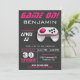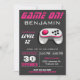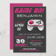 This modern kids birthday party invite features a neon pink and white video game controller and modern typography. Simply add your event details on this easy-to-use template to make it a one-of-a-kind invitation. Flip the card over to reveal a pink and grey stripes pattern on the back of the card.