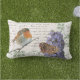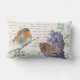 Modern vintage nature photo art. Robin bird, buddleja flowers and butterfly on manuscript and soft green damask background texture. Outdoor pillow.