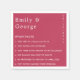 Add a personal touch to your wedding reception with these stylish and modern wedding napkins. The vibrant viva magenta background sets the perfect backdrop for the elegant typography and fun facts about the bride and groom. Your guests will love learning about your favourite things, how you met, and other interesting titbits about your relationship. The design is simple and customisable, allowing you to choose the perfect colour to match your wedding theme. These napkins will not only serve a practical purpose, but they will also add a unique and charming touch to your reception. Make your special day even more memorable with these fun and customisable wedding napkins.