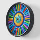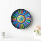 Eye-catching round wall clock featuring an abstract, geometric sunburst of saturated rainbow colours radiating from concentric circles at the centre. Crisp, vector-style stripes in blues, greens, yellows, oranges, reds, and purples contrast with a cool blue background, while slim black hands and a matte black frame keep the look clean and modern. Perfect as a statement piece for living rooms, offices, classrooms, creative studios, or kids’ spaces—adding energy, colour, and contemporary design to any wall.