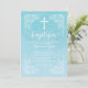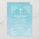 Our beautiful modern watercolor baptism invitation features a vintage scroll frame, a white cross and a chic fancy baptism font set on a pretty turquoise sky blue background. flip our baptism invite over to view a matching back to view a matching back for an extra special touch. Perfect invitation for a baby boys baptism. Visit our shop for this invitation in a large selection of modern & trendy colours.