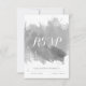 Modern abstract watercolor splash grey winter wedding RSVP reply/response card featuring a hand painted watercolor paint splash with texture in tones of grey, trees in white with snow , snowflakes and text in white and grey.