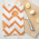 A modern and fresh looking kitchen towel with an orange pattern. There are matching products like napkins, aprons and binders available.