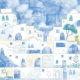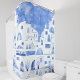 A blue and white watercolor painting of the village of Oia on the Greek island of Santorini.