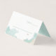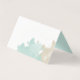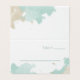 Trendy wedding folded table place card done in white with graphics of tan and mint green watercolor splashes.