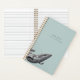 A modern grey and blue green sea themed personalised notebook with a watercolor illustration of a humpback whale on a sea green background. Personalise with your name in grey serif font. Makes a perfect for sea life lovers