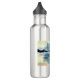 An artistic stainless steel water bottle with a watercolour painting of navy blue and ice white mountain landscape with blush pink clouds atmosphere personalised with a monogram name and initial.