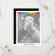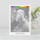 Celebrate your unique love story with this modern editorial wedding announcement card, specifically designed to honor the identity of the LGBTQ+ community with pride and sophistication. This exclusive design features a vibrant rainbow stripe across the top, creating a striking and meaningful visual contrast against an ethereal black and white photograph. A delicate semi-transparent white overlay envelops the background image, providing an artistic softness that allows both the pride colors and your personalized details to stand out with contemporary elegance and absolute visual clarity.