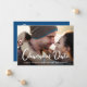 Even though circumstances have required you to postpone your wedding date, show your guests your love goes on with your favourite engagement photograph on this wedding change of date announcement card. On the front, "Change of Date" is written in a large contemporary white script across the bottom of your photo, and underneath you can personalise your names and postponement announcement. On the reverse side, you can personalise your message in more detail and add your new wedding date and venue, all in a simple white typography against a classic blue background.