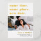 Need to postpone or reschedule your wedding? Let guests know with these modern and lighthearted cards in white with luxe gold foil lettering. Funny and clever typography-based design features "same time, same place, new date" at the top with your new wedding date and details beneath. Customise with a photo, and add additional details to the back.